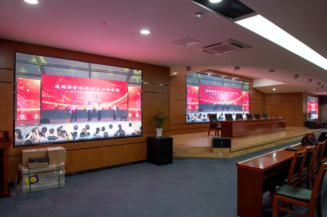 經(jīng)過改造,安全教育館新增3塊LED屏幕,其中主席臺(tái)處主LED顯示屏面積約20平方,東西兩側(cè)輔助LED顯示屏各約6平方。LED屏幕采用顯示單元像素間距為P2-2.5,具有顯示面積大、分辨率高、超高對(duì)比度、超寬視角、無縫拼接、維護(hù)方便等優(yōu)點(diǎn)。改造后進(jìn)一步提升了視頻會(huì)議效果,增加了會(huì)場(chǎng)多功能性。