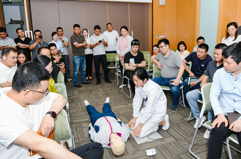 在第一階段活動現(xiàn)場,醫(yī)護人員通過PPT的形式,為大家詳細講解了心肺復(fù)蘇、AED使用、海姆立克急救法的操作要點和注意事項,以及夏季高溫中暑的自救互救應(yīng)急處理知識,并通過互動方式一對一指導(dǎo)教學(xué),鍛煉了實際操作能力。隨后,醫(yī)護人員也為在場職工進行血壓、血糖等項目測量,中醫(yī)把脈問診、家庭醫(yī)生簽約等便民服務(wù),參加此次活動的職工紛紛表示受益匪淺。