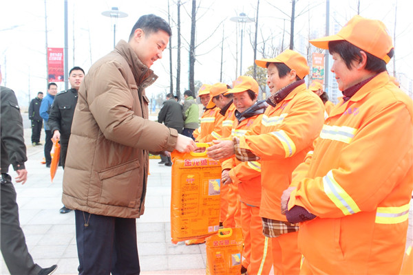 1月18日上午,園區(qū)黨工委委員、管委會(huì)副主任、規(guī)劃建設(shè)局局長(zhǎng)許紹杰帶隊(duì)慰問(wèn)了奮戰(zhàn)在一線的城市維護(hù)作業(yè)人員,向他們送上了春節(jié)的問(wèn)候。
